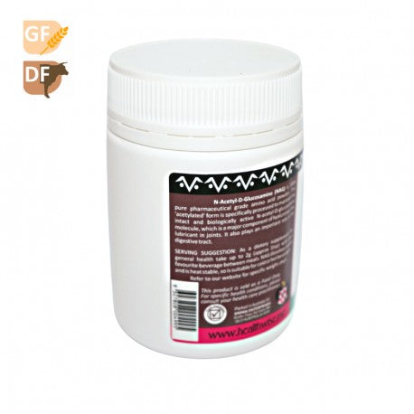 This 'acetylated' form of Glucosamine is specifically processed to maintain the intact and biologically active N-acetyl-D-glucosamine molecule, which is a major component of hyaluronan, the lubricant in joints. It also plays an important role in the digestive tract.