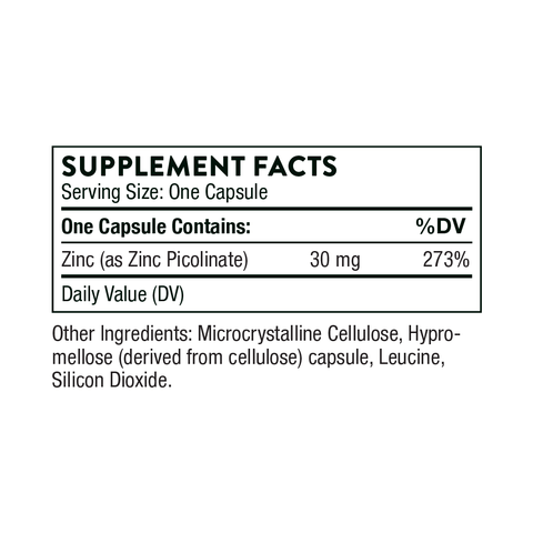 If the body has trouble absorbing a nutrient, then it can't obtain the nutrient’s benefits. Thorne offers two highly absorbable forms of zinc: Zinc Picolinate and Zinc Bisglycinate. Zinc Picolinate is zinc that is bound to the organic acid picolinic acid, which is naturally made in the body from the amino acid L-Tryptophan. Zinc Bisglycinate is zinc that is bound to two molecules of the amino acid glycine – creating a true amino acid chelate.